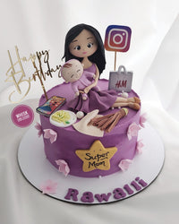 A beautifully crafted Super Mom-themed custom cake featuring a handmade mom-and-baby topper, elements like shopping bags, makeup and Instagram icons. Perfect for celebrating modern moms on birthdays and special occasions.