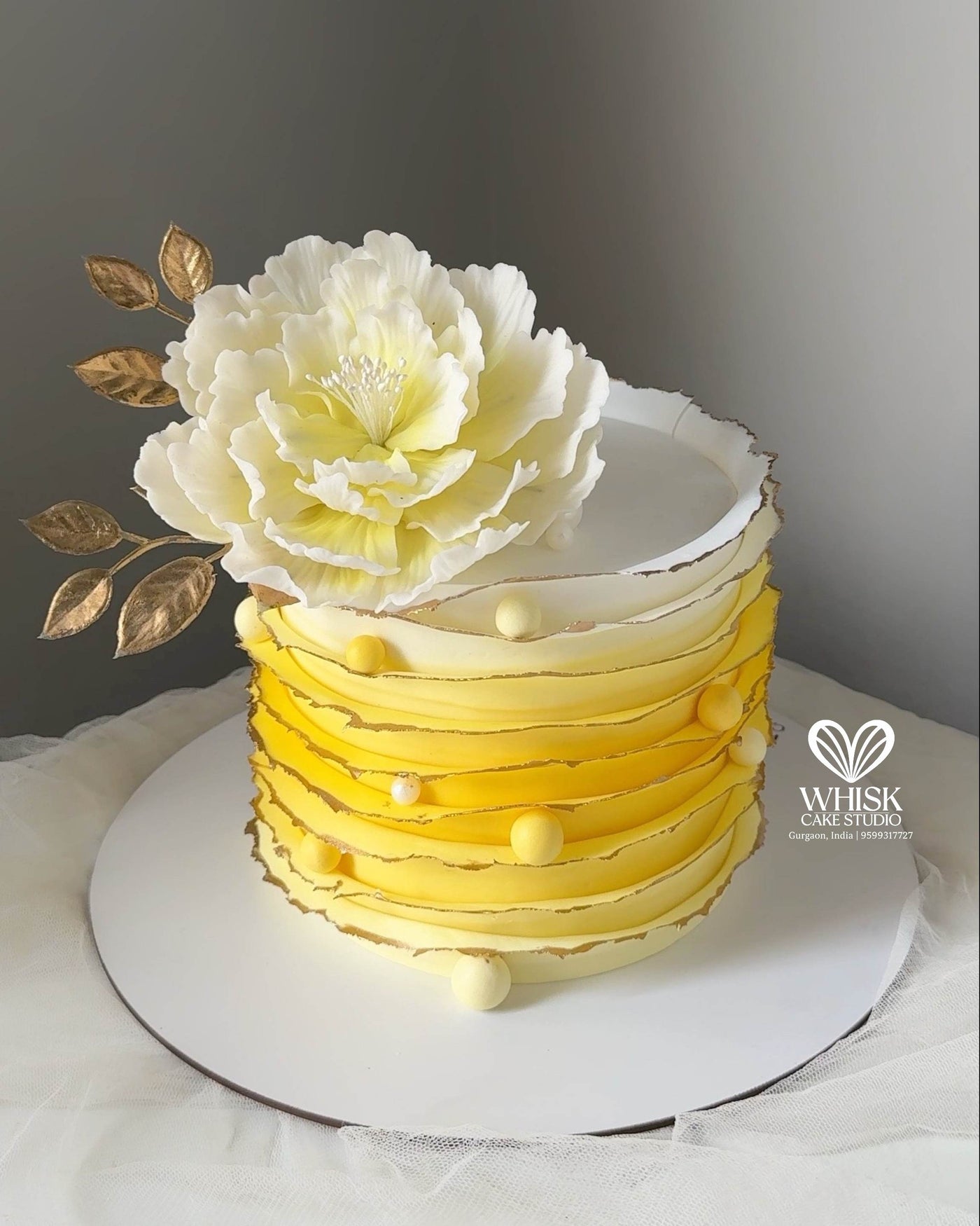 A stunning yellow ruffle custom cake adorned with handcrafted sugar flowers, edible pearls, and gold detailing — perfect for women’s birthdays and elegant celebrations. This designer floral cake adds a bright, luxurious touch to any special occasion.
