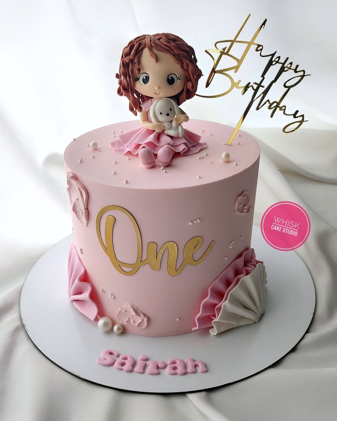 A soft pink non-fondant cake showcasing a cute, handcrafted, edible doll topper with ruffle detailing - designed for an unforgettable celebration of your baby girl.